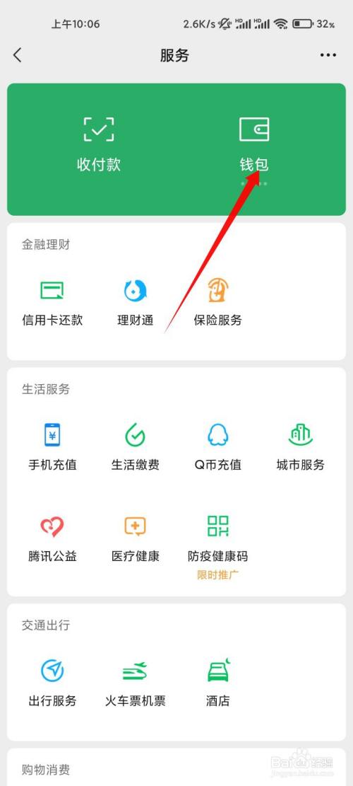 在办事中,点击钱包的选项。