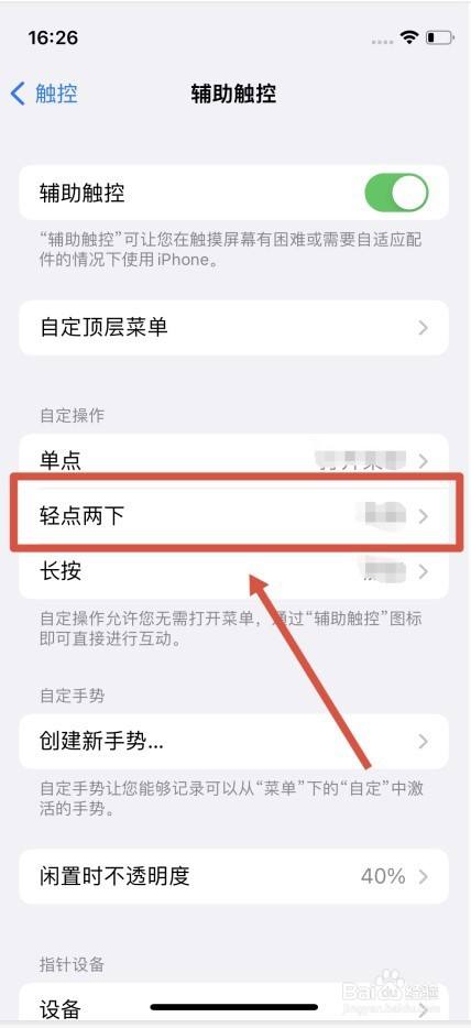 在辅助触控页面中,点击进入自定操作下的“轻点两下”。