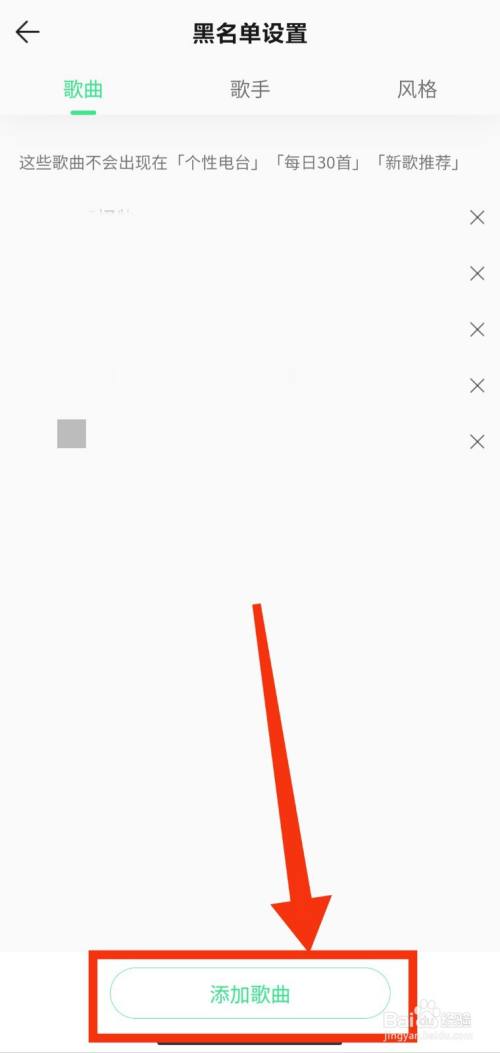 5.点击“添加歌曲”,即可将不喜好的歌曲拉入黑名单,不再保举。