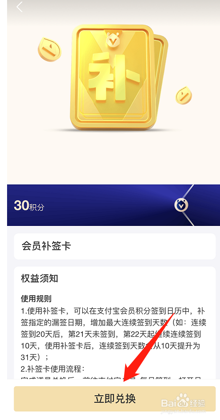进入到会员补签卡兑换页,点击底部“当即兑换”。