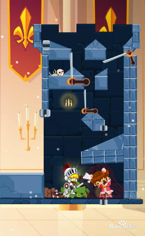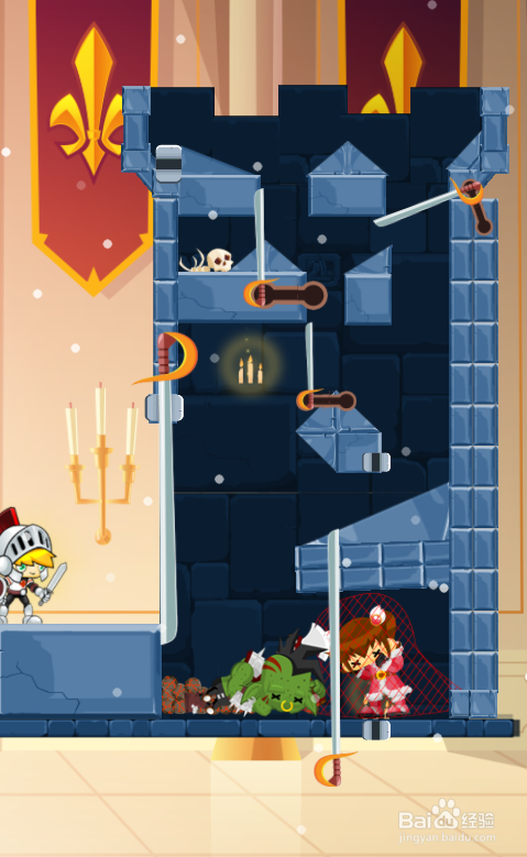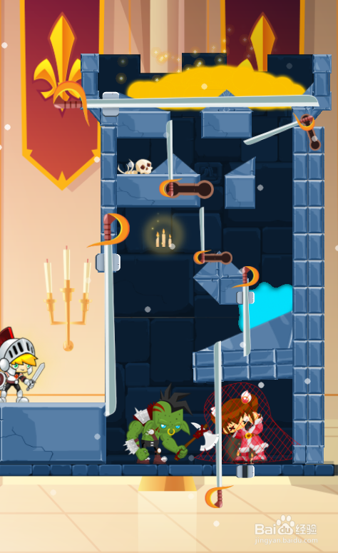 这一关是营救底部的红衣公本家儿,有四个拉针与三个推拉杆,环境如图。