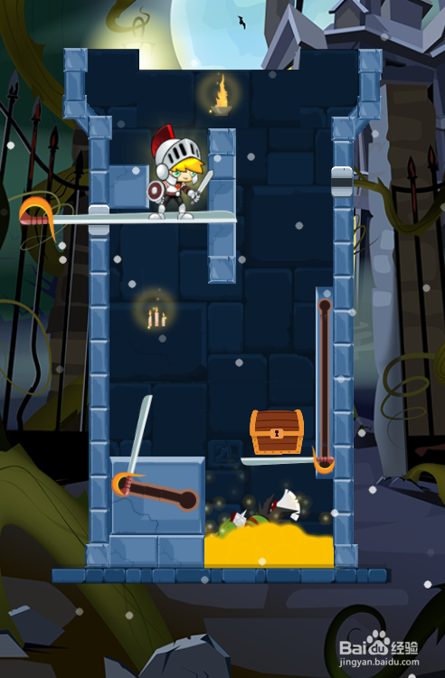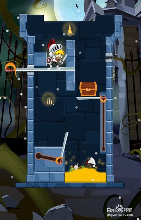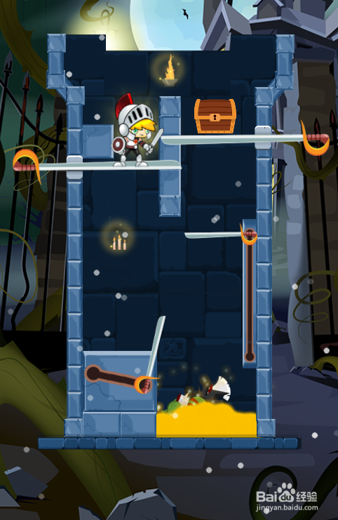 这一关是获得黄色熔岩上侧的宝箱,有两个拉针与两个推拉杆,环境如图。