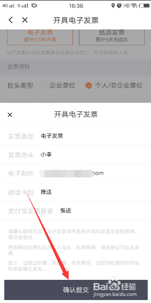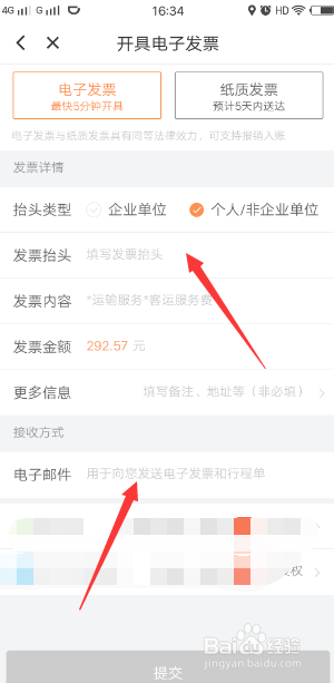 接下来到了拓荒具发票页面,可以选择是电子发票或者纸质发票,这里小编选择电子发票,选择昂首类型,发票昂首名称、吸收发票的邮箱后,点击底部的提交按钮。