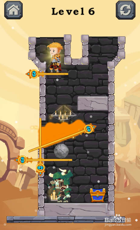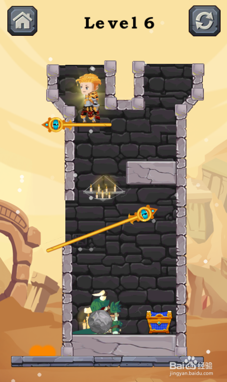 工具/原料一加10 Pro安卓Android 12Once A Hero1.0.3方法/步骤1这一关有五个拉针,熔岩在少年下侧,仇敌站在底部左端,环境如图。2点击拔失熔岩下面的横标的目的拉针,如图。3点击拔失熔岩左侧的竖标的目的拉针,如图。4点击拔失仇敌上侧的横标的目的拉针,如图。5点击拔失巨石上侧的斜标的目的拉针,如图。6点击拔失少年下面的横标的目的拉针,如图。少年获得宝箱,这样就过关了。END