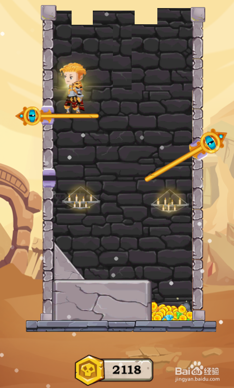 这一关是得到宝藏,共有五个拉针,熔岩在少年下侧,环境如图。
