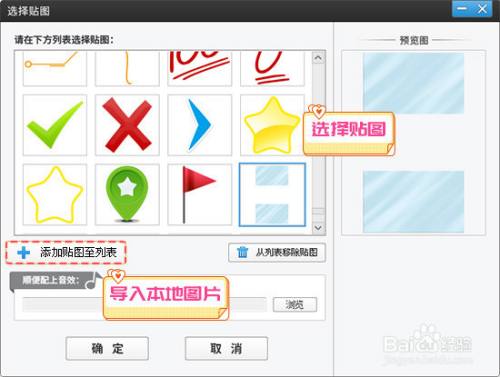 点击“添加音频”按钮,在弹出的下拉框中,选择“添加音效”或“添加配景音乐”,然后选中音频文件,点击“打开”,进入“预览/截取”对话框,截取需要的音频片断,在“此音频将被默认插入到:”栏目中,选择需要的选项。