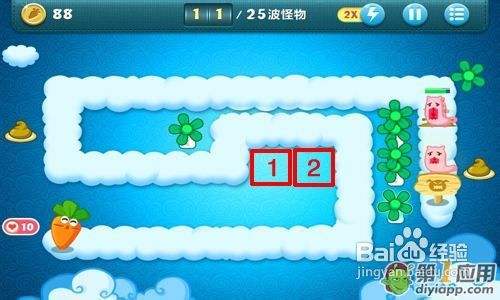 覆灭了第10波怪,第4个电扇炮塔也升为顶级,接下来玩家需要在1号红色方框内制作1个电扇炮塔、2号方框内制作1个便便炮塔,然后继续覆灭怪物累积款项守卫萝卜,接着把电扇和便便升为顶级(如下图所示)。