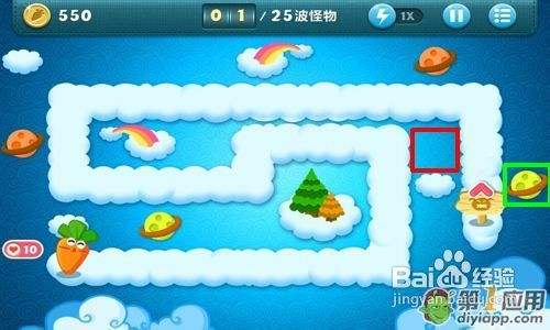 守卫萝卜天际本家儿题第6关开局,有550款项供玩家利用,玩家需要在红色方框内制作1个电扇炮塔,然后摧毁绿色方框内的停滞物而且覆灭第1波怪物,最后把电扇炮塔升为顶级(如下图所示)。
