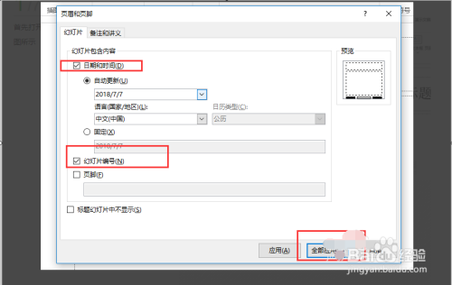 接着在弹出的页眉页脚界面中勾选日期和时间,幻灯片编号即可并按全数应用按钮