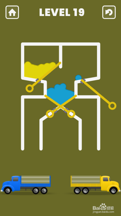 这一关共有四个拉针,斜标的目的拉针上面有两种颜色的水溶液,环境如图。