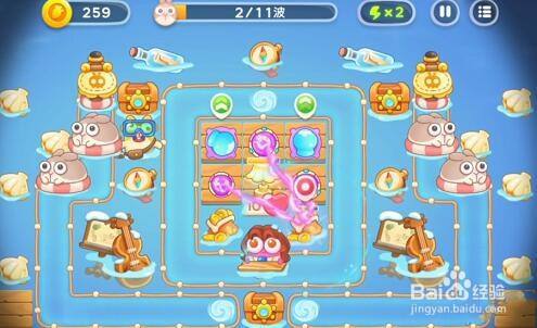 4、第三波出来滑板兔,在两侧放置电磁塔、雪球,减速塔,优先进级电磁塔。