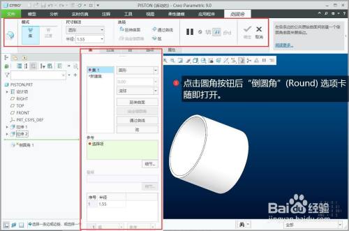 点击“倒圆角”按钮后,“倒圆角”(Round) 选项卡随即打开。