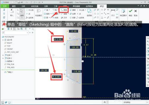 单击“草绘”(Sketching) 组中的 “圆角”(Fillet)按钮为如图两处添加R3的圆角。