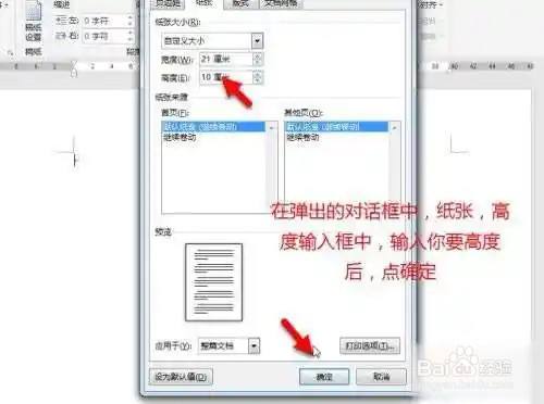 在弹出的对话框中,纸张,高度输入框中,输入您要高度后,点确定。