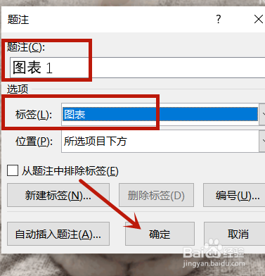 进入“题注”对话框,找到标具名样,点击其右边【倒三角】图标,在弹出的下拉框中,点击【图表】字样;