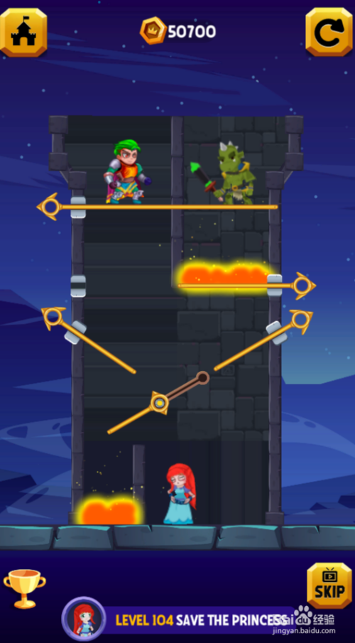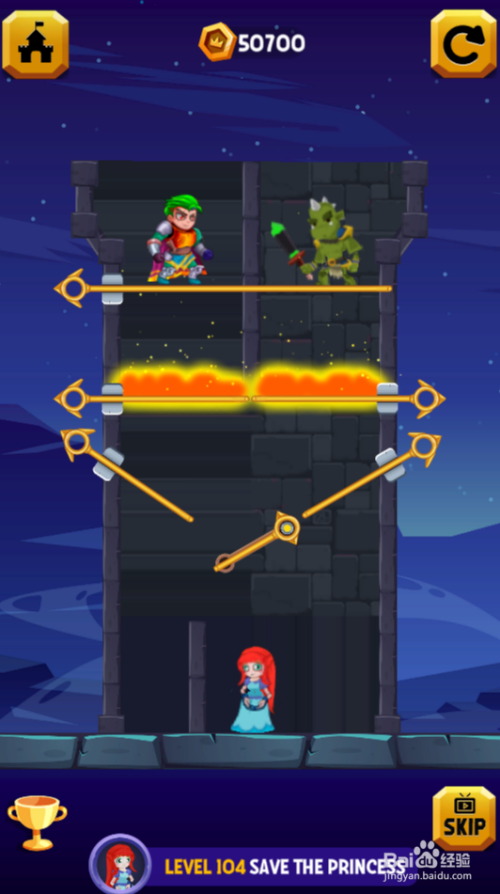 这一关有五个拉针与一个滑杆,使命是营救底部的公本家儿,环境如图。