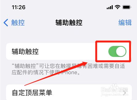 在辅助触控诉设置界面,将“辅助触控诉”功效激活。