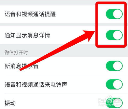 将“语音和视频通话提示”和“通知显示动静详情”选项均点亮。