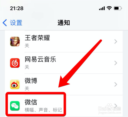 在通知页面中,选择“微信”设置选项。