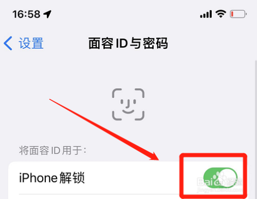 在面目面貌ID与密码设置界面,将“iPhone解锁”选项点亮。