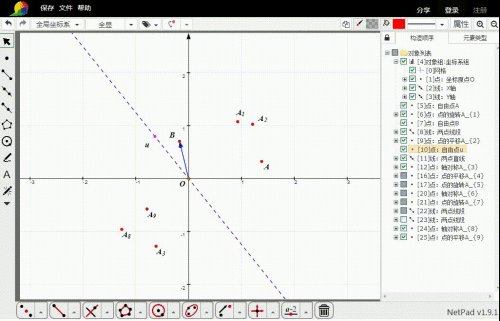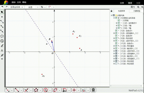 选择点A和直线u,再点击轴对称变换东西,就获得A关于u的对称点A3。
