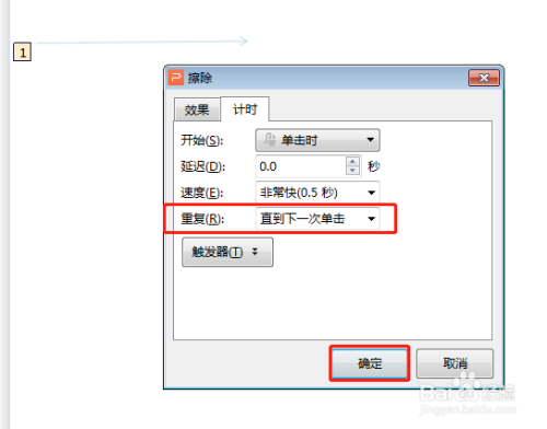 在效果选项窗口,点击“计时”,“反复”选项中,选择“直到下一次单击”,单击确定。