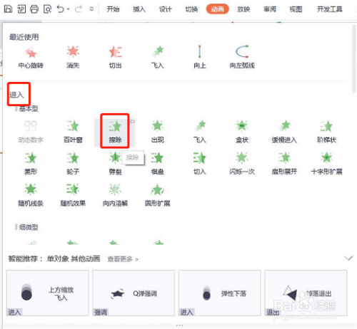 在动画下拉选项中,单击进入动画,选择擦除。