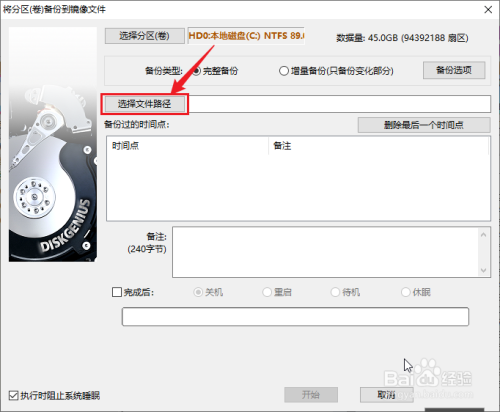 点击“将分区(卷)备份到镜像文件”对话框中的“选择文件路径”按钮。