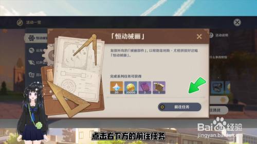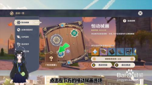 工具/原料黑鲨3JOYUI12原神2.8方法/步骤1点击右上方的活动图标2点击左下方的恒动械画选项3点击右下方的前去使命4点击右下方的追踪方针5找到尤格并与之对话6点击右侧的拼接械画7根据视频中的方式完当作拼接8找到尤格对话,完当作对话后,即可得到恒动械画安排END