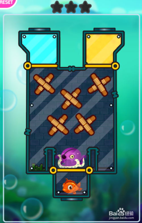 这一关共有三个横标的目的拉针,紫色章鱼在小红鱼的上侧,环境如图。
