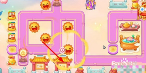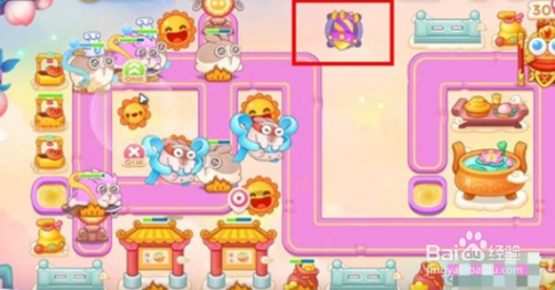 开始的时辰在左上角满级太阳花,中心上面一个一级导弹塔,先打下图位置蛋糕。