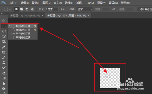 然后在左边功效栏选择【矩形选框东西】,在透明画布上画一个正方形,按住【Shift】用鼠标即可画一个等边的正方形。