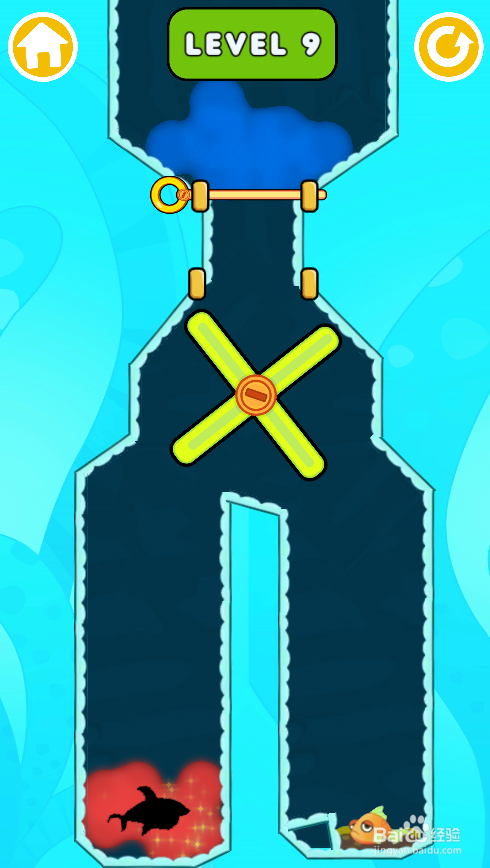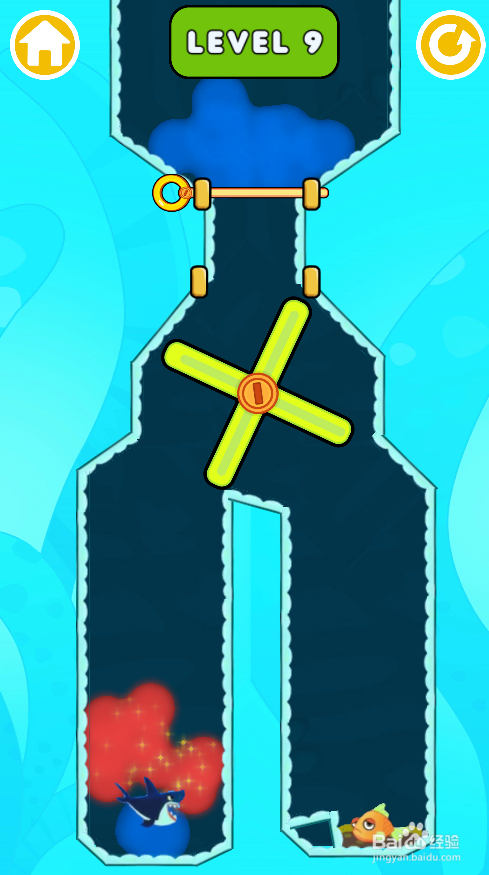 这一关在拉针的下侧有一个顺时针扭转的转轴,小鱼在右侧底部,环境如图。