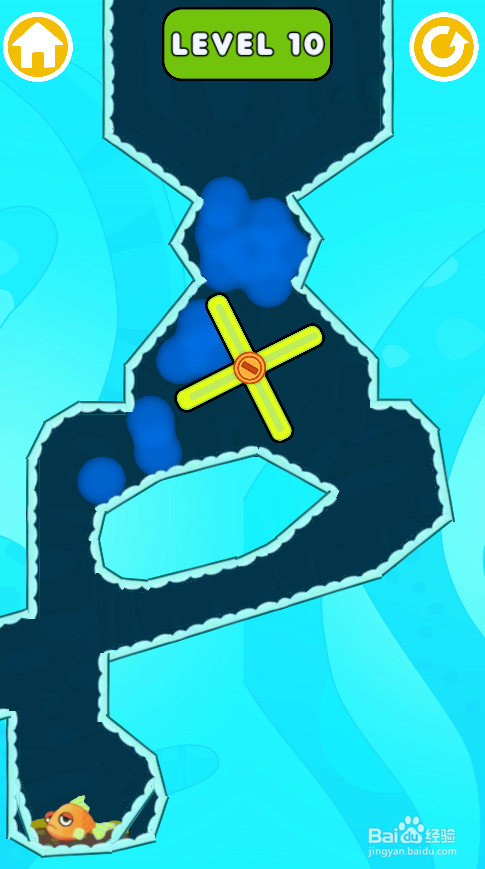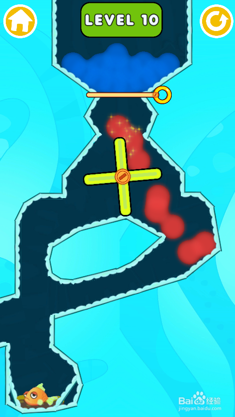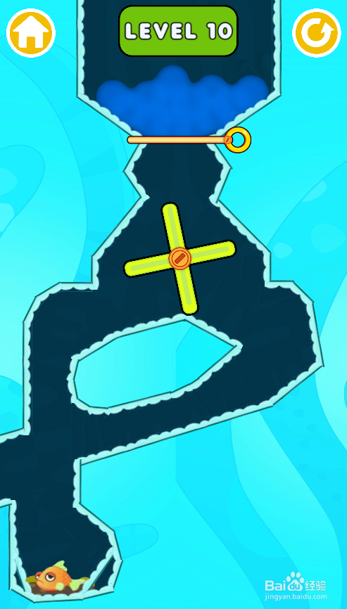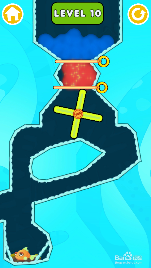 这个关卡的下端左侧是开放的,转轴上侧有两个横标的目的拉针,小鱼在底部,环境如图。