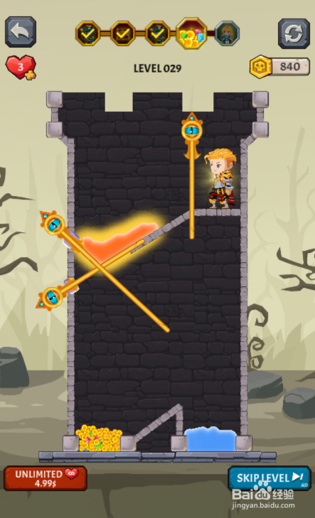 这一关内里有四个拉针,使命是得到宝藏,熔岩在少年的左侧,环境如图。