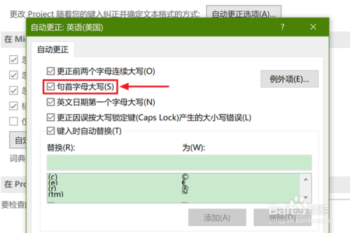 最后在“主动更正”对话框中,勾选“句首字母大写”即可。