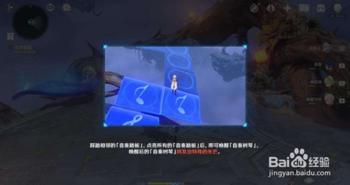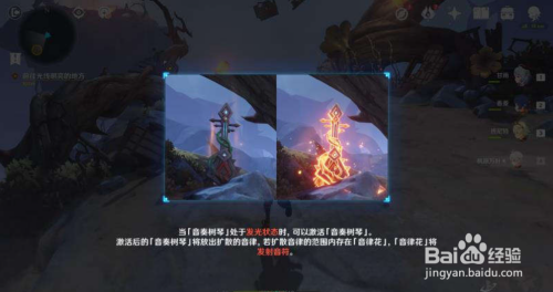 来到下个平台,稍微走一点路,呈现音奏树琴的教程指引,我们可以知道吹奏树琴发出的乐律可以扩散到乐律花从而发射音符。
