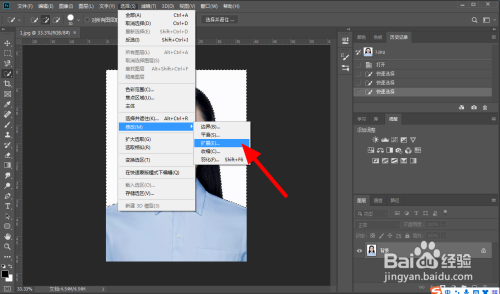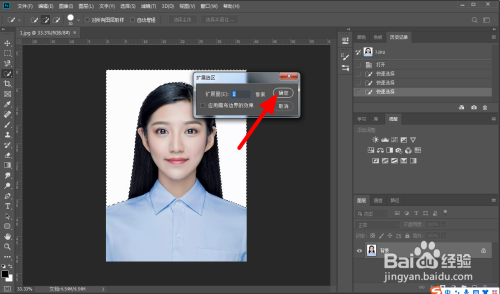在扩展选区页面,设置扩展量为【1】,点击【确定】。