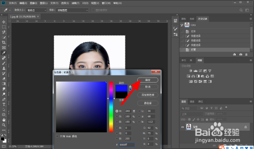 在拾色器页面,选择【蓝色】,点击【确定】。