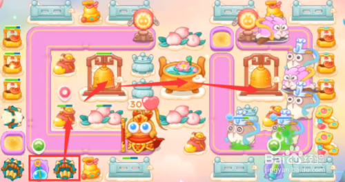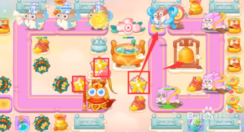 第一步,这一关我们可以选择的炮塔为毒针、多重箭、泡泡塔、星星、烟花,这一关我们利用多重箭输出星星防空。