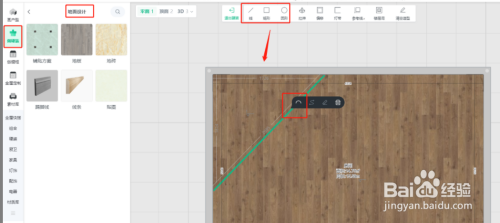 做硬装,点击地面设计,使用页面上方绘画东西,如是用线,矩形绘制,绘制好后点击选择正圆弧。