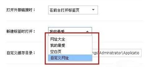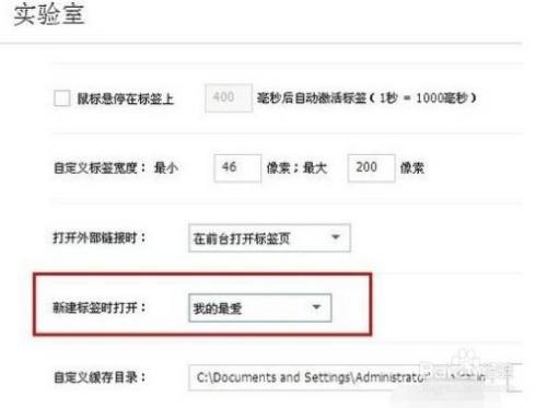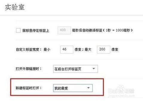 然后在实验室里可以看到有个“新建标签时打开”,右边默认是“我的最爱”: