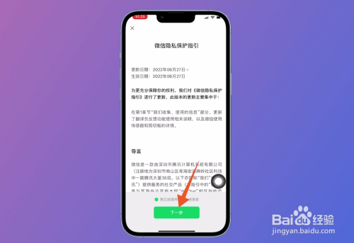 打开隐私掩护只有页面后,勾选赞成相干条条目,点击页面中的【下一步】,举行注册微信即可。