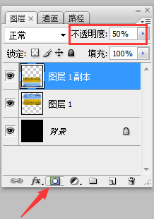 翻转后的图层透明度降低,先设置为50%,再点击图层面板下的第三个按钮添加图层蒙版;