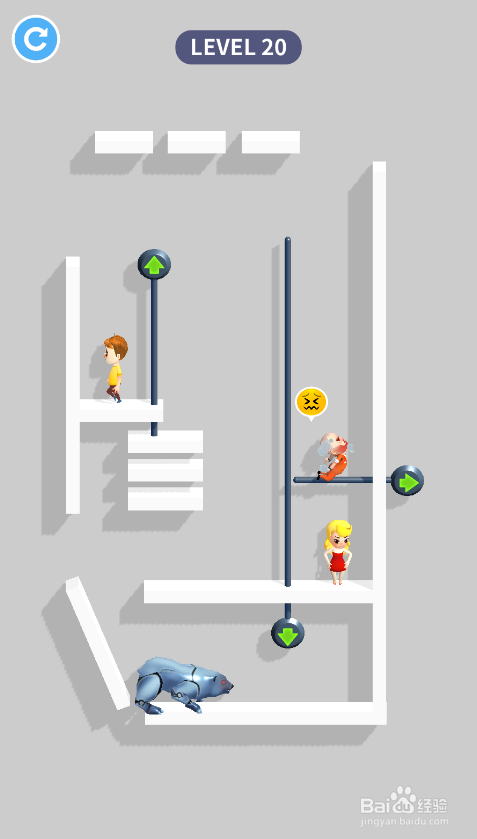 这一关内里有五个拉针,猛兽在底部,匪徒漫衍在女孩的左侧及上侧,环境如图。