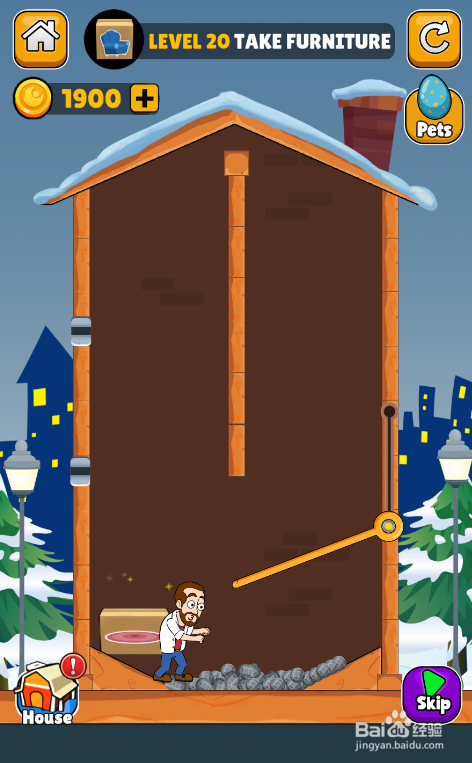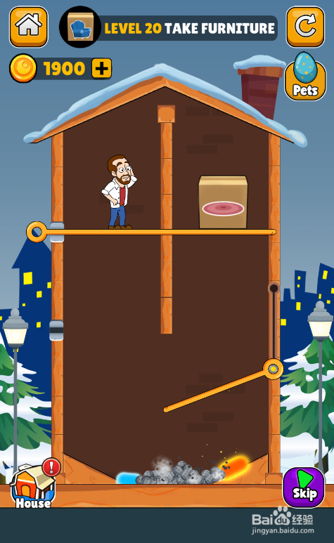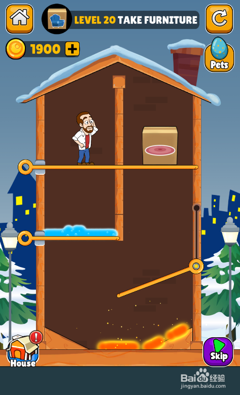 这一关内里有两个横标的目的拉针和一个推拉杆,使命是得到家具,熔岩在家具下侧,环境如图。