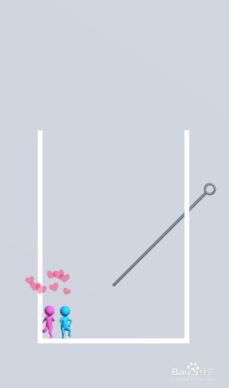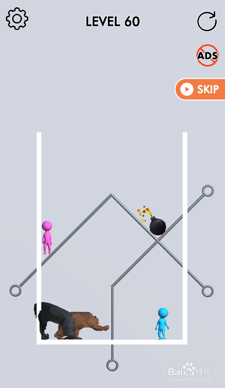 这一关内里有五个插销,大猩猩在中间位置,粉色人在左上侧,蓝色人在右下侧,地雷在右上侧,棕熊在左下侧,环境如图。