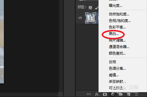 Photoshop 打开图片,点击调解层图标。在菜单选择“黑白”。