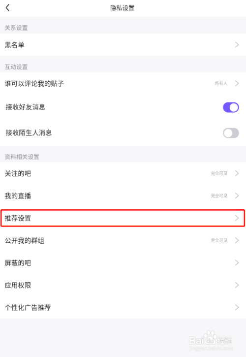 打开如下图界面,选择保举设置选项,点击打开
