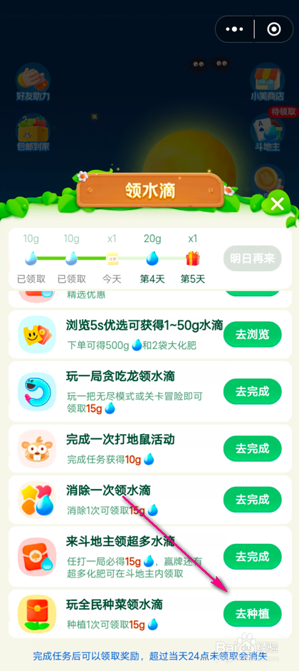 在跳出的使命栏内,找到全民种菜,点击右侧绿色图标。